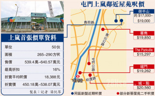 上车盘争登场,楼花期约2年的建灏地产旗下屯门景秀里2号上岚公布首张价单共50伙,全属一房户,扣除180日即供付款最高16%折扣,折实平均尺价18,388元,与邻近由新地发展的御半山II最新成交尺价相若,265方尺一房户折实入场450.18万元,全数50伙即供折实价低过539万元。●香港文汇报记者 梁悦琴