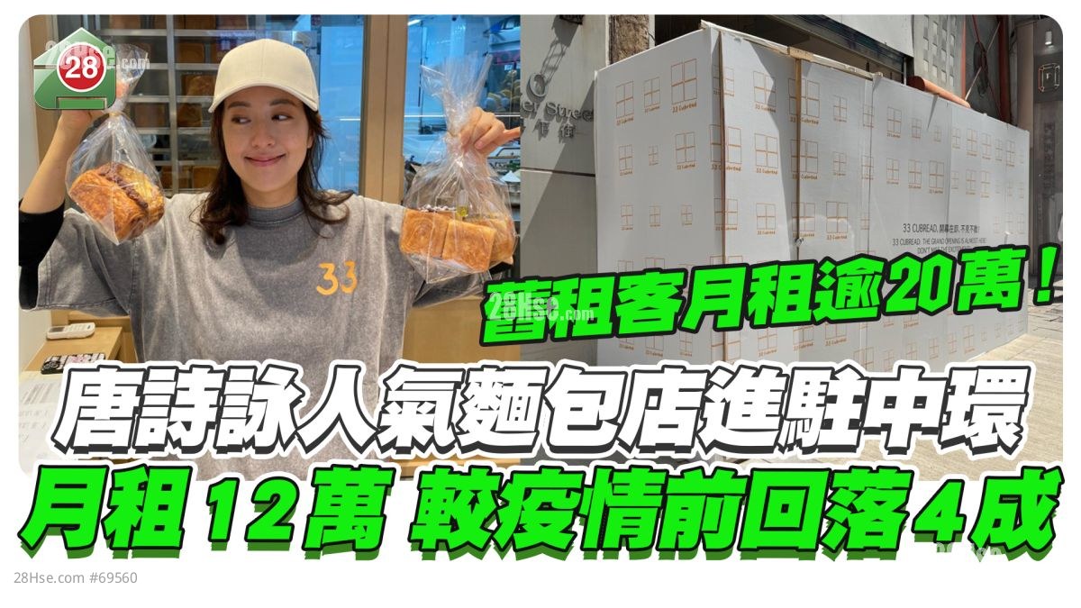 據悉,「33 Cubread」租下中環砵甸乍街14至16號太富商業大廈一個地舖,建築面積1,243方呎,月租12萬,平均呎租97元。該舖舊租客為日本餐廳,早於疫情前月租逾20萬,現時最新租金較疫情前大減40%。業主見租客為一間人氣麵包店,故願意平租,期望帶動人流。