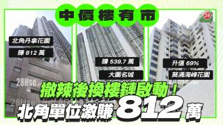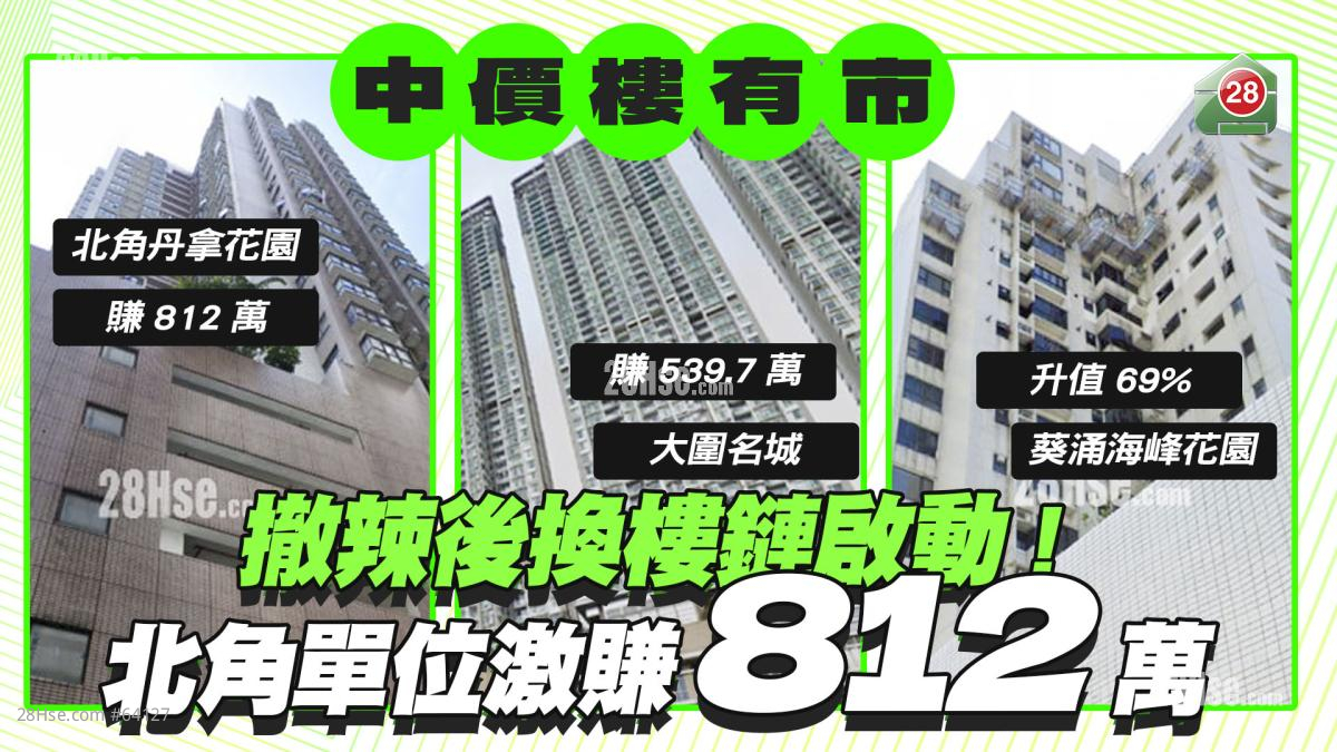 北角丹拿花園二座中層F室,面積約840平方呎,三房套間隔,開價1380萬,換樓客議價後以1150萬承接,平均呎價約13690元。原業主2003年以338萬購入,21年後轉售,獲利812萬,樓價翻了2.4倍。
