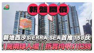新地旗下西沙SIERRA SEA 今日(4月15日)公布首張價單,首批提供158伙,戶型涵蓋一房至三房,入場價299.8萬起,折實平均呎價10,398元。發展商指,首張價單全部單位折實價均低於600萬元。