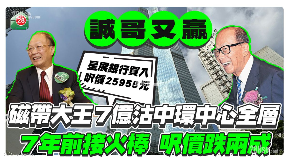 翻查寫字樓成交紀錄,陳秉志2017年11月,夥拍多位投資者以402億元購入中環中心超過7成樓面,當時平均呎價約3.3萬元,而陳秉志則持有7層。換言之,是次陳秉志以7億元轉手中環中心66樓全層,樓面呎價下跌7,042元或逾21%。