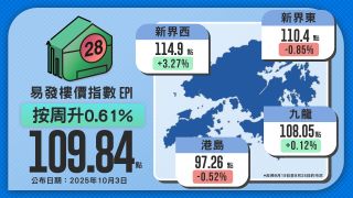 本港二手樓價持續反覆向上,最新易發樓價指數報109.84點,按周回升0.61%,創今年新高,雖仍較2021年高位回落逾32%,但年內已累升3.09%,顯示市場逐步築底回暖。隨着多間大型銀行跟隨美國聯儲局減息,供樓負擔下降,刺激購買力釋放並帶動成交回升;據代理行統計,十大屋苑於9月20至21日周末共錄得最多15宗成交,按周升近六成,印證減息效應正加快準買家入市步伐。同時,施政報告方向亦利好樓市,其中「新資本投資者入境計劃」將住宅物業投資門檻由5,000萬港元降至3,000萬港元,非住宅物業納入投資上限則由1,000萬提高至1,500萬,進一步吸納境外投資者,改善置業與投資氣氛。在息口下降與政策支持的雙重推動下,樓市有望持續回暖,指數或於今年內挑戰110.92點水平,即撤辣前低位。